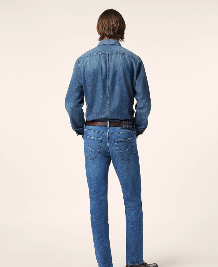 • Medium blue lightweight cotton indigo denim, stonewashed and hand-sanded for a soft feel (7.5 ounces)