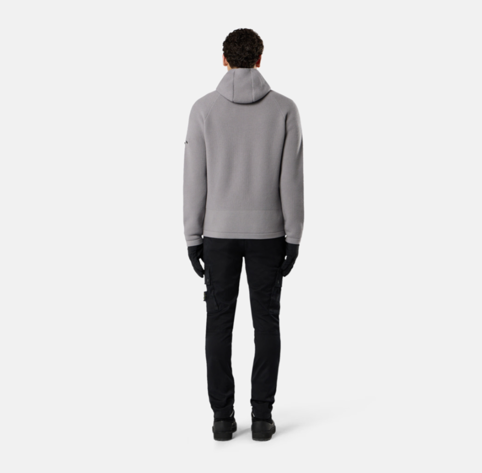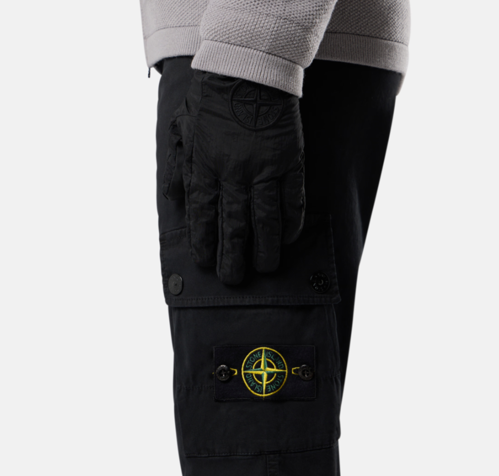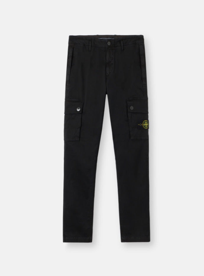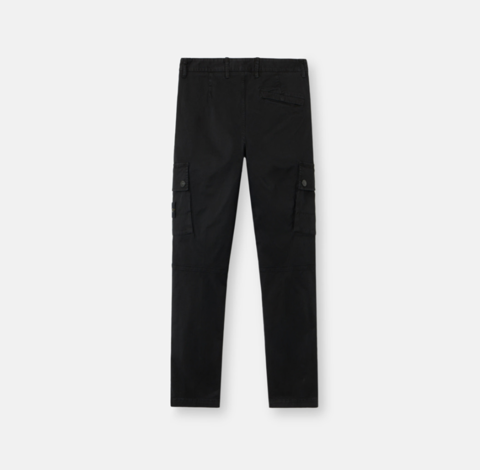 Standing hand pockets with hidden zip. One slanted back pocket with snap hidden under fixed flap. Bellows flap pocket on each leg with two snaps; Stone Island badge on left leg pocket. Zip and button fly. Slim fit.