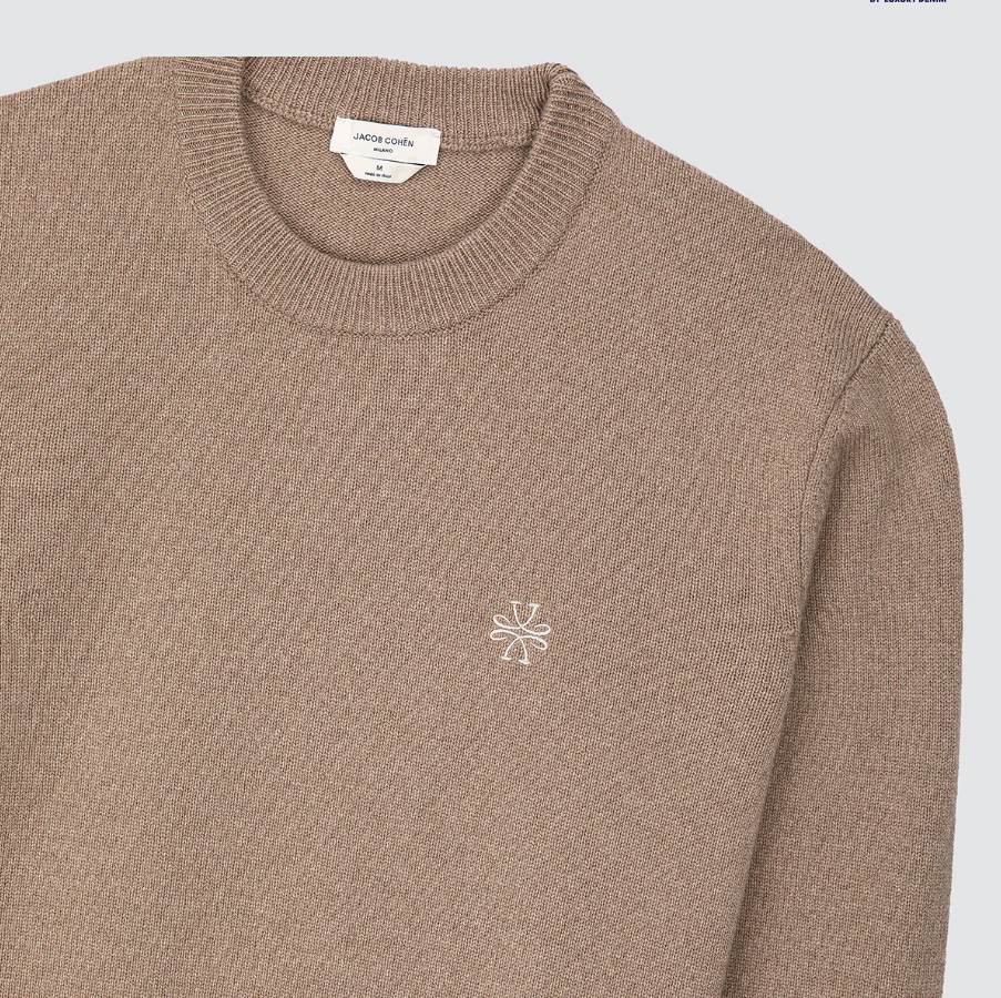 Crewneck jumper with long sleevesBeige melange wool and cashmere blend, plain stitch gauge 7Embroidered logoRibbed trims