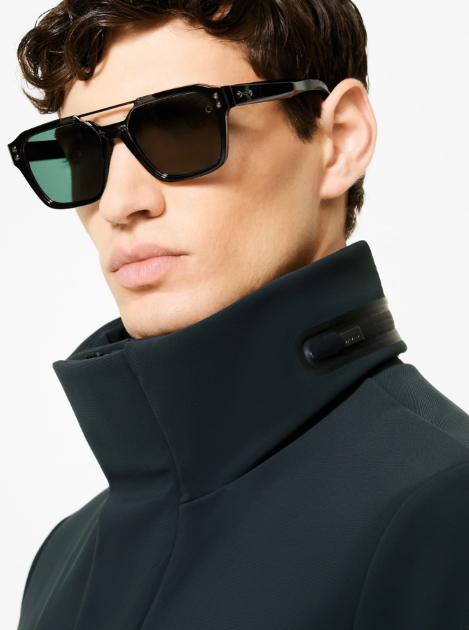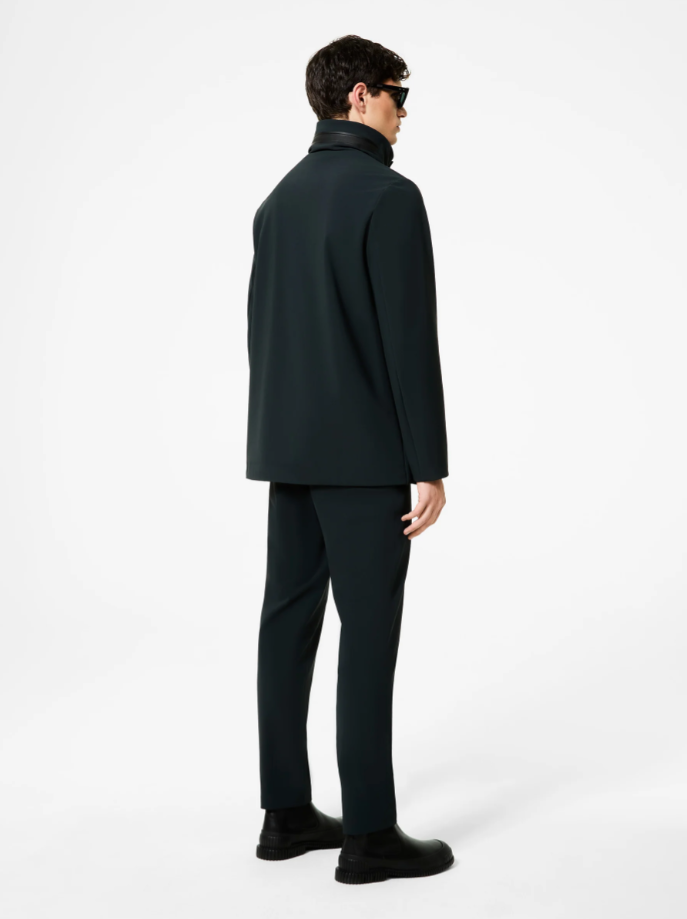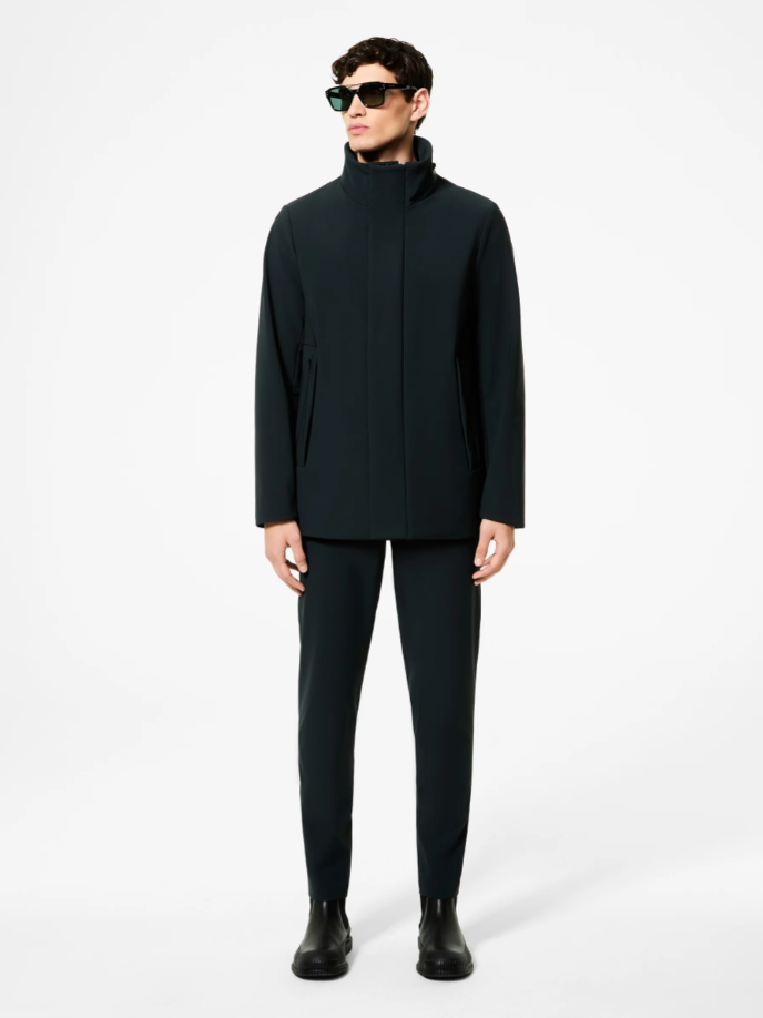 This mid-length winter outerwear features a refined design and clean lines that minimize the visible elements of its sophisticated construction. The waterproof and breathable membrane Stratofabric#3 offers the super-matte look of the exclusive SURFLEX® smooth-touch finish and a premium velvet lining. The double-slide front zipper is concealed by a flap with metal snaps. A zipper accesses the utility hood, which is tucked into the high, protective stand-up collar. The jacket features practical welt and invisible zippered side pockets on each side. The cuffs are adjustable with snaps. Inside, a breast pocket with invisible zip is enlivened by a double neon orange welt and the signature "Made with love, designed in Tuscany" heart tag.